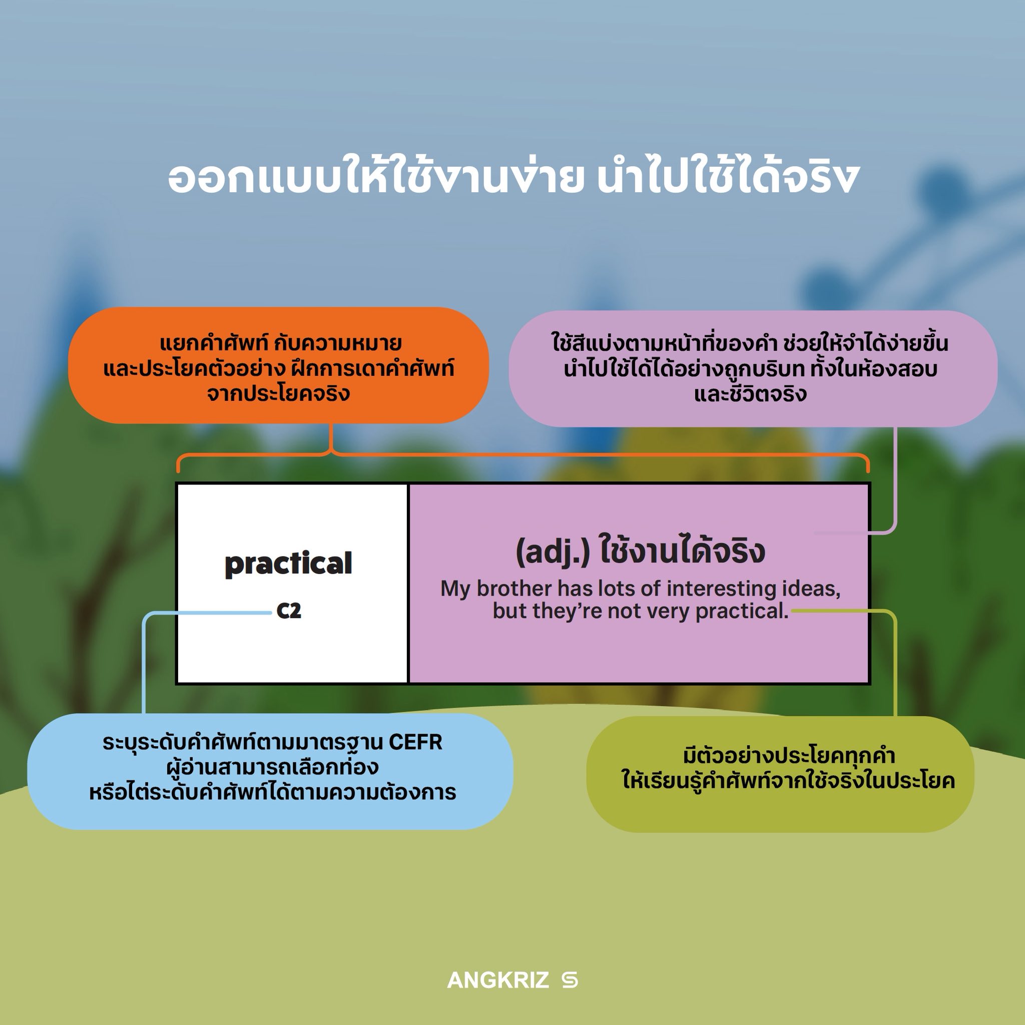 - มาพร้อมประโยคตัวอย่างการใช้งาน ฝึกเดาคำศัพท์จากบริบท